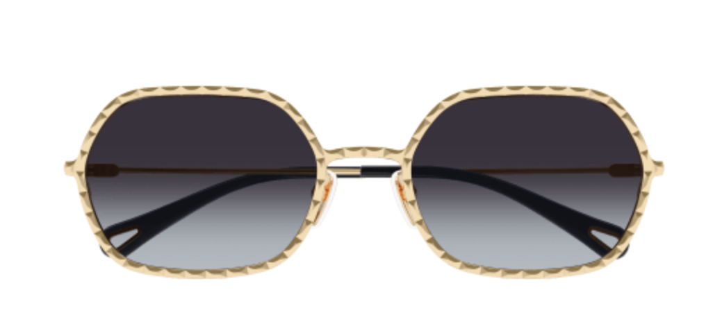 Montatura stretta e rettangolare in metallo con delicato motivo ondulato fresato sui cerchi. Light Gold Chloé abbinato a lenti colorate con doppia sfumatura. Terminali in acetato con profilo Chloé in metallo sulle estremità.